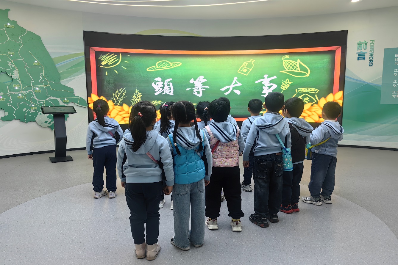 幼儿充满期待、认真的跟着工作人员的讲解走进了粮食世界。拾阶而上,顶部吊挂的稻穗随风而动,稻花香里说丰年等诗句诉说着丰收的喜悦。饥饿危机从未远离,勤劳勇敢的中国人民用智慧守护住了大国的粮食安全,幼儿走进了中国粮食安全展区,呈现了粮食生产、供应、改革、产业多元发展成果。走进粮仓内部,讲解员用孩子们的语言讲解了绿色仓储设施、绿色储粮技术、绿色粮库管理集成应用等,全面感知江苏粮储多端发展,实现节粮减损、减能降耗,粮食储备的质量正不断提升,各类粮食安全检测的高精尖仪器,包括品质检测仪、水分检测仪、显微镜等,配合特色影像画面动静结合展示了江苏粮食高质量保障系统。各类字体的“粮”字构成了一方小的艺术显示空间,艺术化呈现了“粮”在不同历史时间中的具象表达。一颗水稻,从种子变成粮仓里的果实需要多久——由一字排开的点触式透明展屏,生动演绎了水稻从一粒种子变成满仓粮的成长历程。孩子们认真的观看着,知道了科技文化也是同样应用到了粮食生产中。